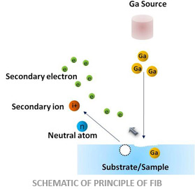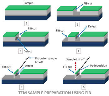 FIB (Focused Ion Beam) is a popular technique in the semiconductor industry and material science for imaging, circuit modification and to prepare precise cross section of sample for STEM and TEM. The FIB instrument is similar to an SEM (Scanning Electron Microscope) but uses a focused ion beam instead of focused electron beam. A finely collimated beam of ions operating at low beam current is generally used for imaging and at higher beam current the FIB can be used for sputtering or milling materials precisely. A dual beam FIB/SEM integrates both ion beam source and electron beam source giving a unique advantage of milling the sample or sputtering material by ion beam and imaging the same at the same time using the electron beam. A progressive FIB milling gives a much clearer idea about the nature of the defect or the failure mode.